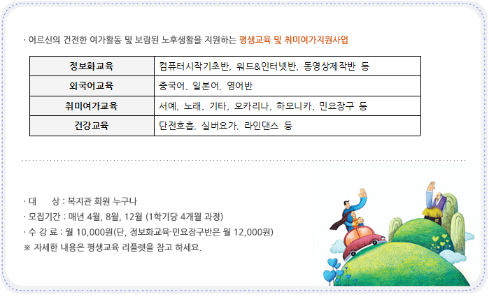 < Àå»ê³ëÀκ¹Áö°ü < »ç¾÷¾È³» < Æò»ý±³À° ¹× Ãë¹Ì¿©°¡ Áö¿ø»ç¾÷